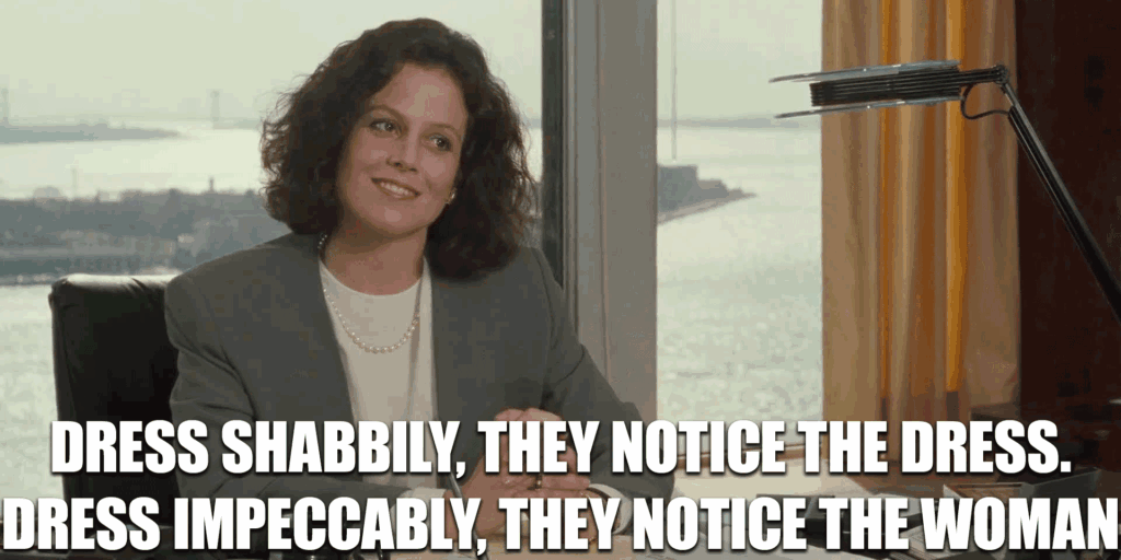 Tess follows Power Suit Ripley’s advice about women dressing in the work place as she picks an outfit for a work event:
